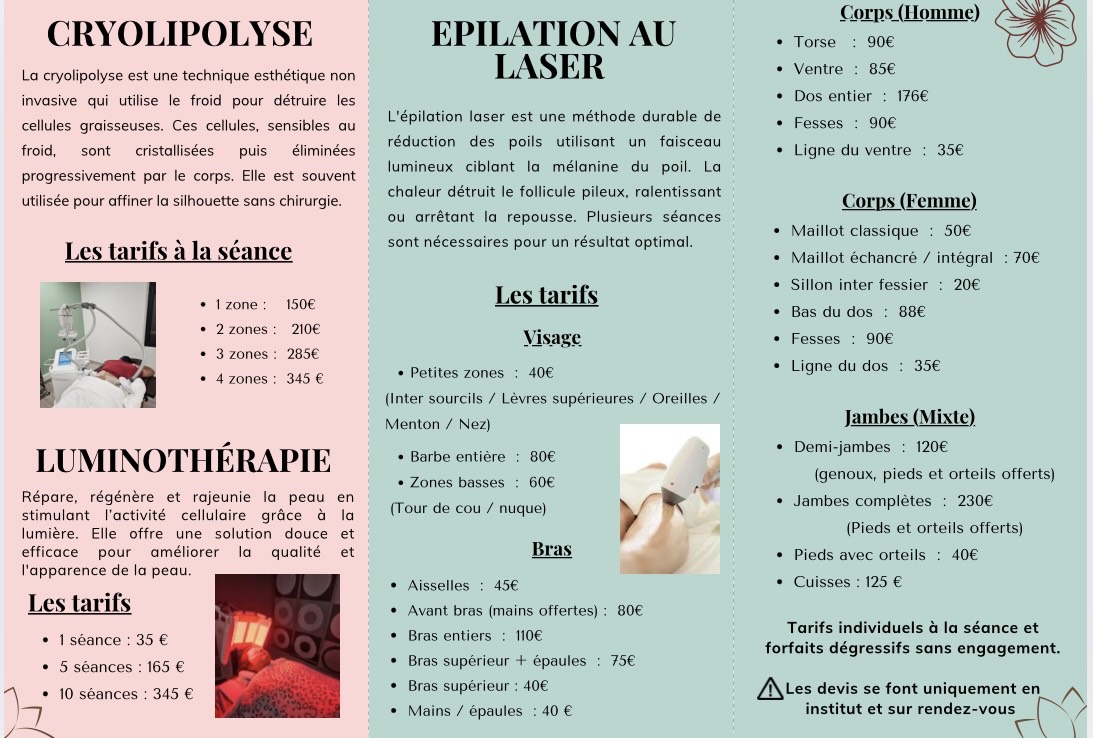 épilation laser, cryolipolyse pour la réduction de la masse graisseuse, luminothérapie et radiofréquence visage et corps.